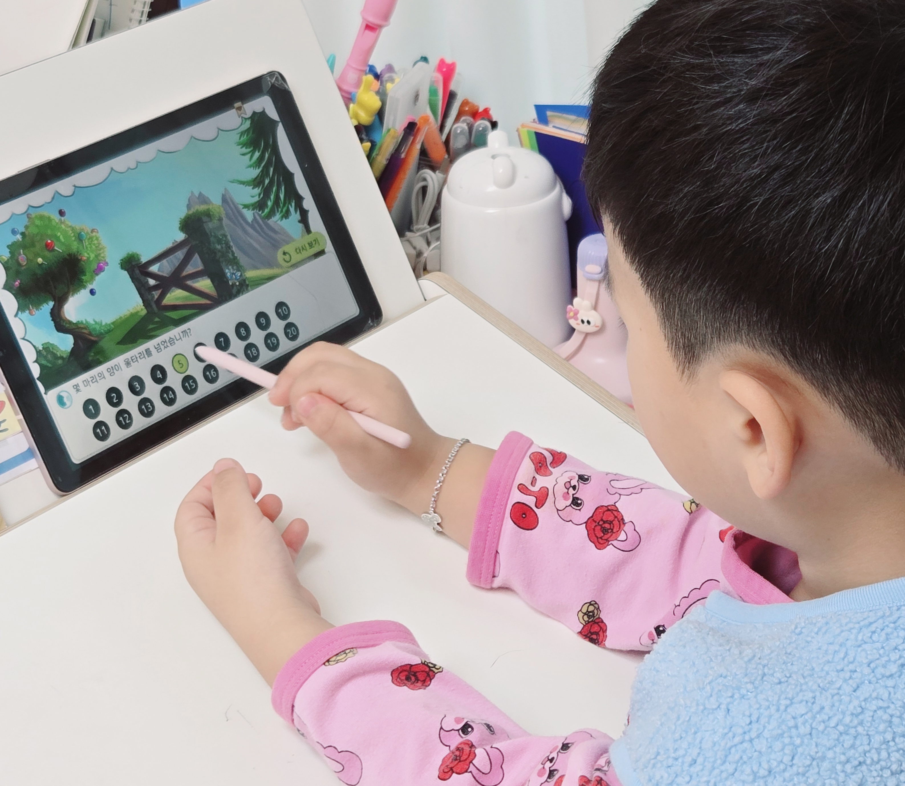 5살 아이 처음에는 몬스터를 보고 괴물이라며 무서워했는데 몬스터 안나오는 학습부터 하면서 재미를 붙히더니 이제는 열심히 공부해요! 게임형이라서 클리어하는 재미가 있는지 공부하자고 하면 맨날 조금 하다가 그만하는 아이가 이제는 자기가 먼저 수학게임 틀어달라며 태블릿을 가지고 오네요~!